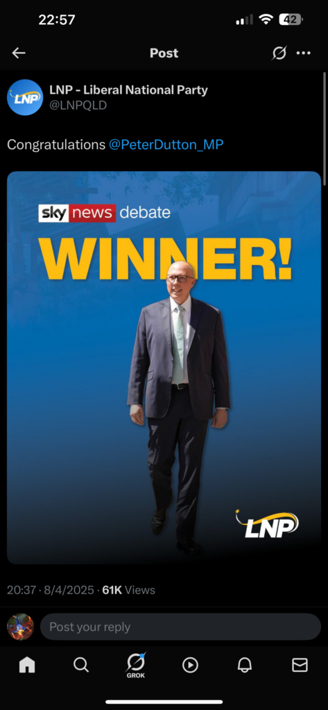 Of course not. Everyone loses from a trade war. But now is not the time to roll the dice with someone like Peter Dutton, talking about recession here. It’s not the time for US-style cuts or US-style politics here in Australia. The last thing that Australia needs right now is a pale imitation of the United States here in Australia.