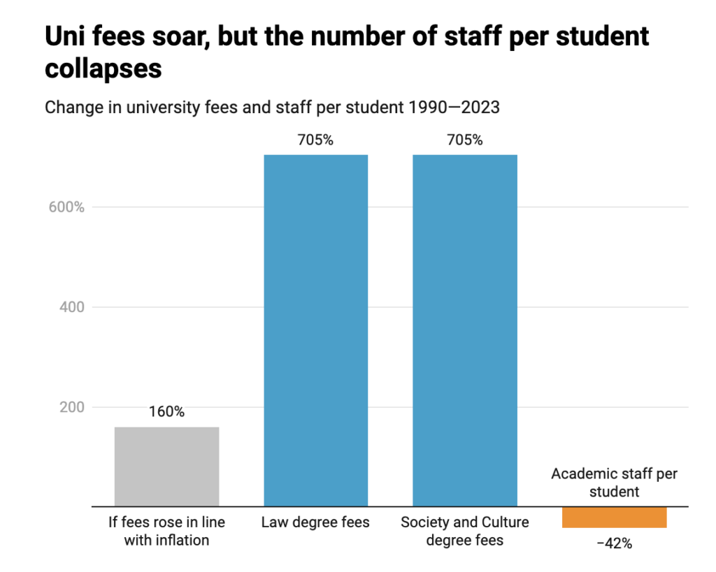 For example, degrees in areas like Law, Society and Culture are 700% more expensive than they were in 1990 (the year after the HECS/HELP scheme was introduced), while staff-to-student ratios have gone from 1-to13 in 1990 to more than 1-to-22 today.