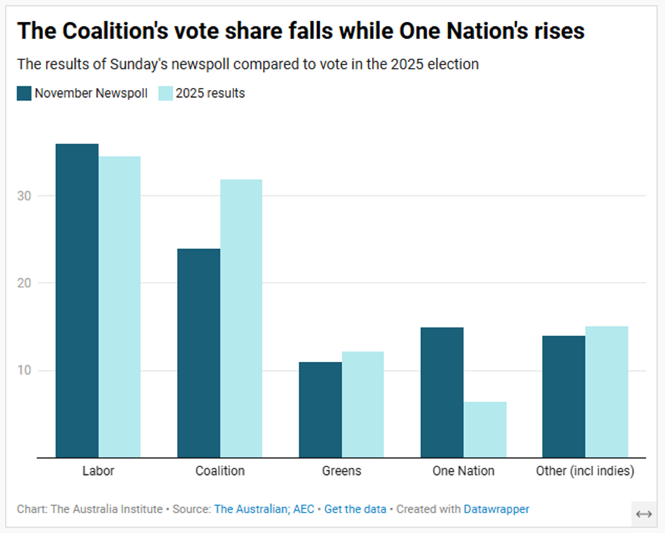 The poll reported Labor has 36% of the primary vote, the Coalition 24%, Greens 11%, One Nation 15%, and other candidates (including independents) 14% collectively. On two-party preferred, Labor leads 57% to 43% (up just shy of two points from the election in May).