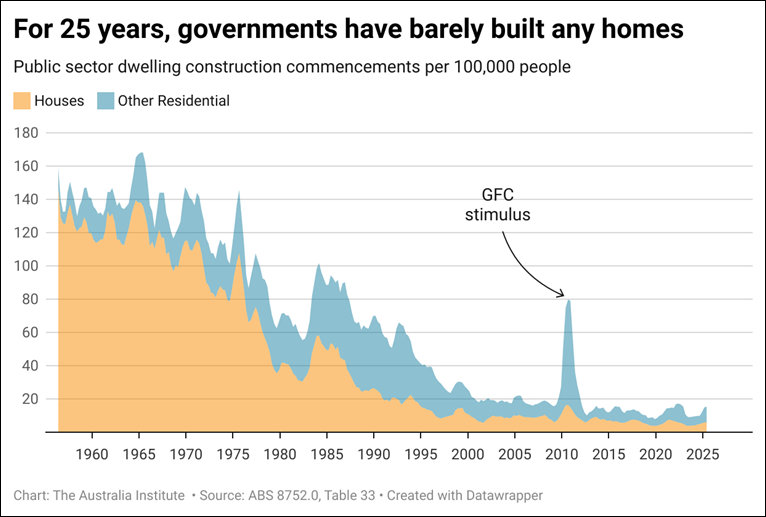 Public and social housing is one of the major aspects missing from the Australian housing puzzle for well over 25 years. Way back in the mists of time (you know the 1960s and 1970s) public housing was not a rarity. Each year around 120 new public sector dwelling were being built per 100,000 residents. It’s why when Anthony Albanese talks about how he grew up in public housing, it actually doesn’t quite have the same meaning as it does now.