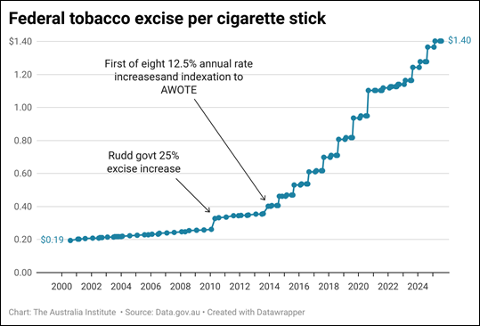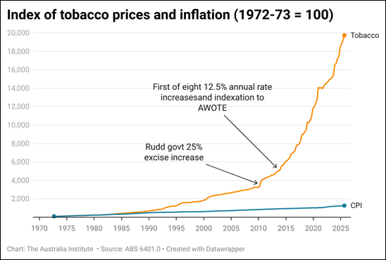 That is due to firstly the Rudd government increasing tobacco excise by 25% in 2010 and then instituting a series of 12.5% increases from 2013 onwards. This has sent the price of tobacco soaring above inflation:
