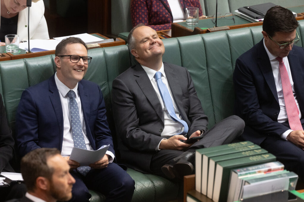 Opposition deputy Ted O’Brien and Alex Hawke during question time in the House of representatives in Parliament House, Canberra this afternoon. Thursday 6th November 2025. Photograph by Mike Bowers