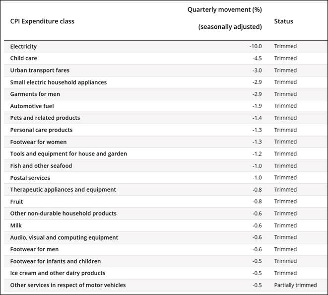 Well, it’s basically just a way of measuring inflation that gets rid of the big rises and big falls – to measure more of the “middle”. Why do that? The RBA likes to use it because it helps then not get too worried if in a certain period something weird happens (like a cyclone sending the price of bananas sky high) that sees the official measure of inflation, the Consumer Price Index (CPI) rise or fall. In such times the “core” inflation probably won’t move much.