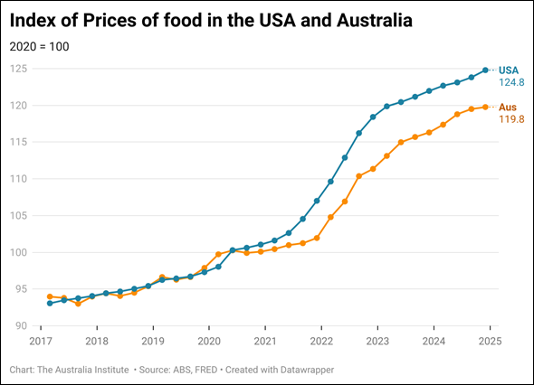 Well let’s look at the USA. Since June 2022 prices here for groceries have risen 12% compared to 10.5% in the USA. But prices stated going up earlier in the USA, so since 2020, the average price of groceries in Australia have risen 19.8% while in the USA they have risen 24.8%