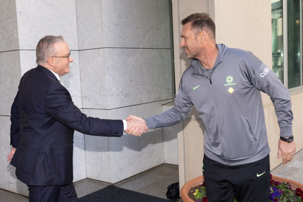 Prime Minister Anthony Albanese and Sports Minister (the only political job I’d ever want) Anika Wells have met representatives of the Socceroos in the PM’s courtyard, ahead of the friendly against New Zealand in Canberra tomorrow night.