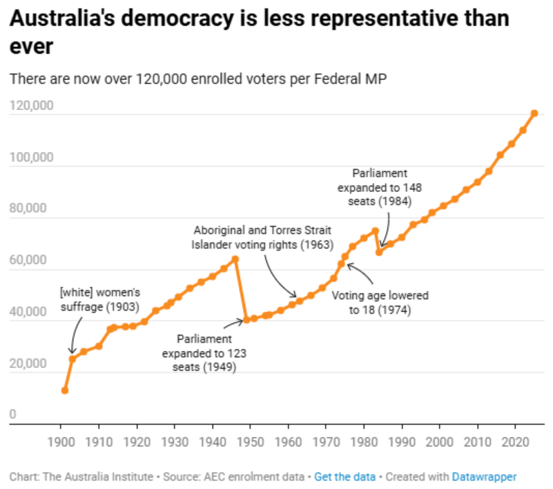 It’s been 40 years since Australia last expanded the parliament, when Hawke government increased the number of seats from 125 to 148. Since then, the population has grown by 11 million, without Australians getting any more MPs to represent them.