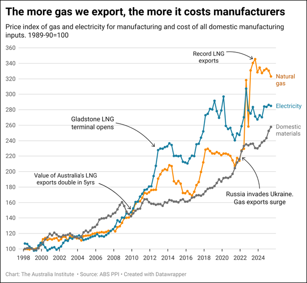 In Australia, as readers will no doubt know, we export about 80% of our gas. So, despite being roughly tied with the USA and Qatar as the biggest exporter of LNG we constantly have stories about a possible “gas shortage”. That in itself is bad enough, but since the opening of the Gladstone LNG terminal, the price of gas, and electricity, has been tied to the world price for gas. And the picture is clear – as Australia’s exports have gone up, so too has the cost of gas and electricity for manufacturers.