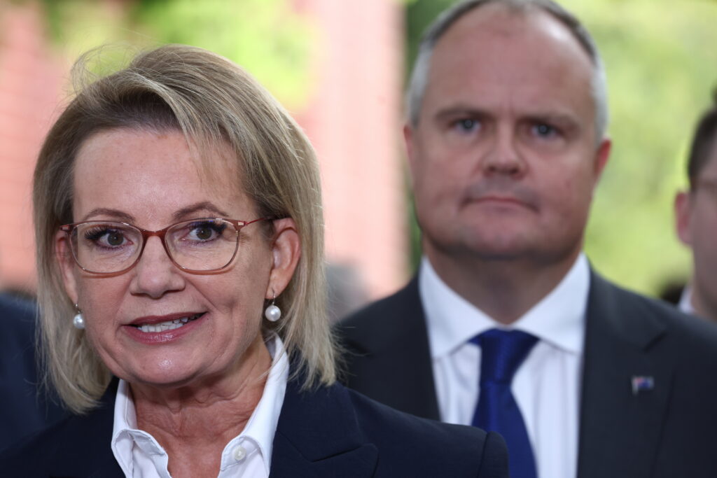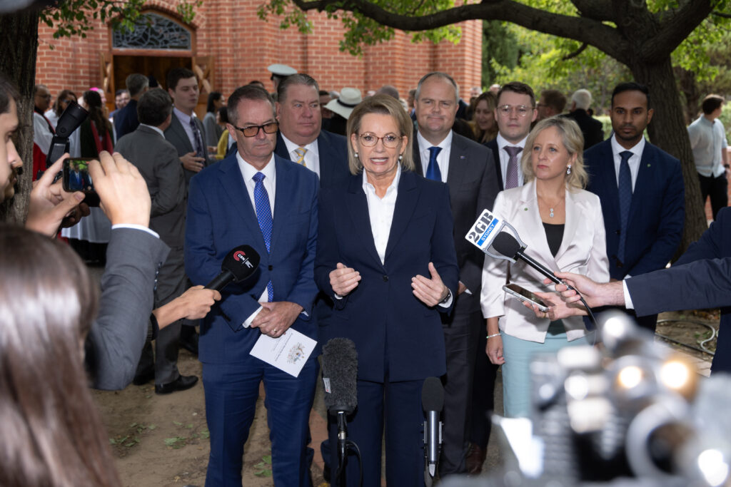 Opposition Leader Sussan Ley talks to the media with her Liberal colleagues aPhotograph by Mike Bowers.